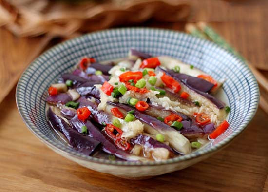 1、茄子洗净切大块,隔水蒸8分钟左右。