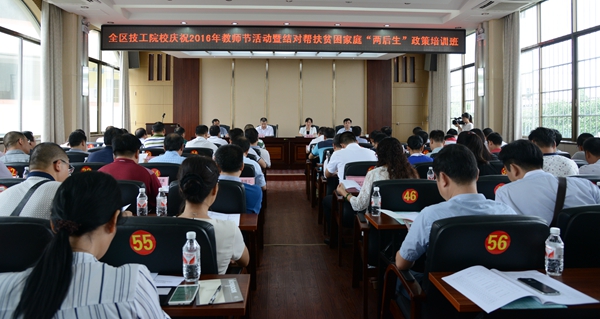 9月8日,广西技工院校2016年教师节慰问活动暨结对帮扶贫困家庭“两后生”政策培训班在广西交通技师学院举行。自治区人社厅副厅长潘志金、职业能力建设处处长杨春华等领导出席。来自全区46所技工院校120多名代表参加了会议。