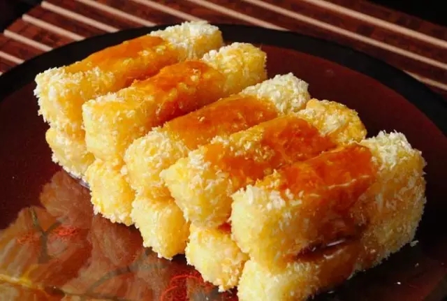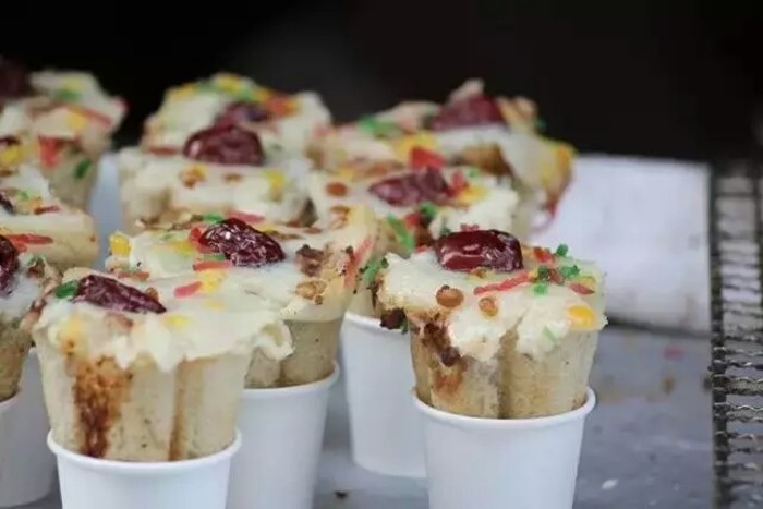 它用面粉加水拌成浆状,注入烤热的梅花模具,再放入元宵,红枣,豆沙,松子,青红果等各种馅料。最后撒上白糖,烤熟即可。