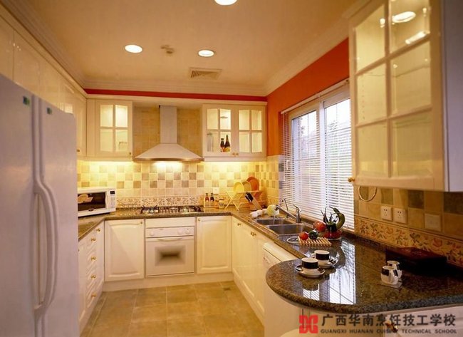 厨房是个潮湿易积水的场所,所有表面装饰用材都应选择防水耐水性能优良的材料。地面、操作台面的材料应不漏水、不渗水。墙面、顶棚材料应耐水、可用水擦洗。橱柜内部设计的用料必须易于清理, 好选用不易污染,容易清洗、防湿、防热而又耐用的材料,像瓷砖、防水涂料、PVC板、防火板、人造大理石等都是厨房中运用得多的安全材料。