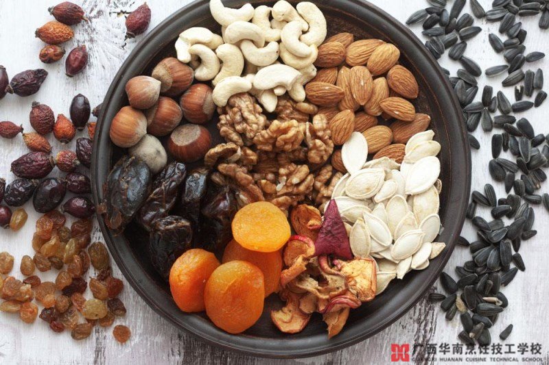 坚果也是一种很好的零食。坚果是植物的精华部分,一般都营养丰富,含蛋白质、油脂、矿物质、维生素较高,对人体生长发育、增强体质、预防疾病有极好的功效。在选择上,广西华南烹饪技工学校建议原味和不开口的坚果,这样能最大程度地保证其营养价值。不过由于坚果的脂肪量很高,不可食用太多,一天一把为好。