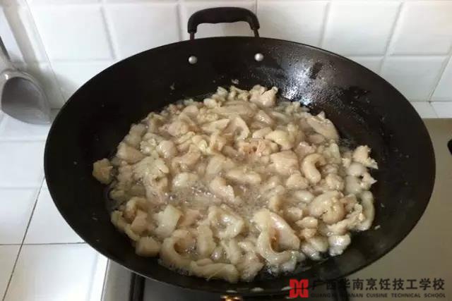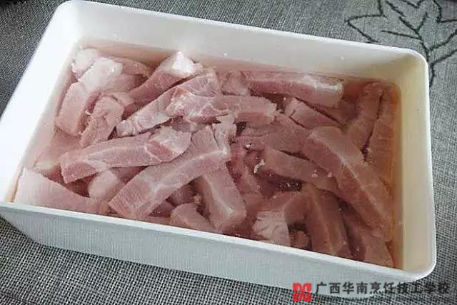 二、将切好的猪肉片放在漏勺里,在沸水中晃几下,待肉刚变色时就起水,沥干水分,然后下锅炒,几分钟即熟,鲜嫩可口。