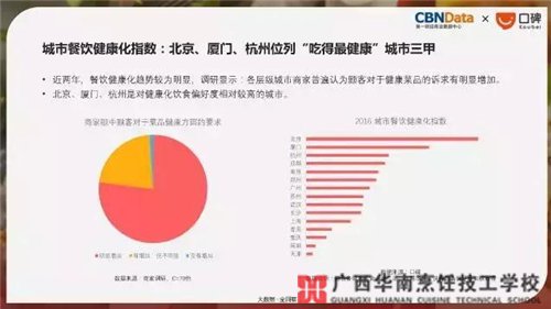 1、阿里旗下“口碑”网联合第一财经商业数据中心合作推出的《2017中国餐饮消费报告》中指出,各层级城市商家普遍认为顾客对健康菜品的诉求有明显增加。