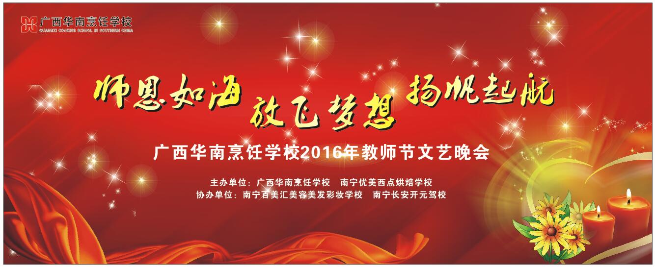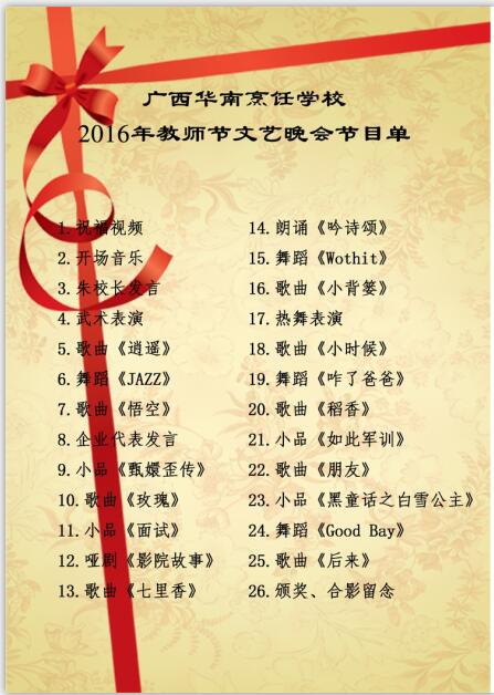 为庆祝第32个教师节的到来,广西华南烹饪学校联合南宁优美西点烘焙学校共同举办的“师恩如海 放飞梦想 扬帆起航”教师节文艺晚会将于9月9日晚间开演。这场晚会的节目单现已出炉!