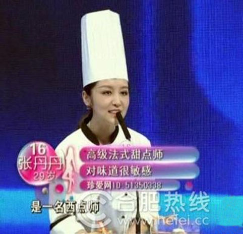 20130120期《非诚勿扰》,新上场的女嘉宾张丹丹,目前从事高级法式甜点师的工作。珍爱网自我介绍说:“大家好,我是丹丹,来自深圳,是一名西点师,之前我是在法国的两所厨艺大学学习西点专业,其实我的梦想就是能够用心做好每一块甜点,分享给所有心怀美好梦想、为目标努力的人。”张丹丹刚上台就以西点师造型出场,并现场为3位老师和台上23位女嘉宾带来了自己做的甜点。美丽西点师现场献甜点,霎时,引起了全场人的羡慕。