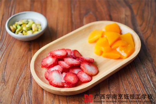 2、开心果去壳,糖水黄桃切成小块,冷冻好的草莓取出切片。